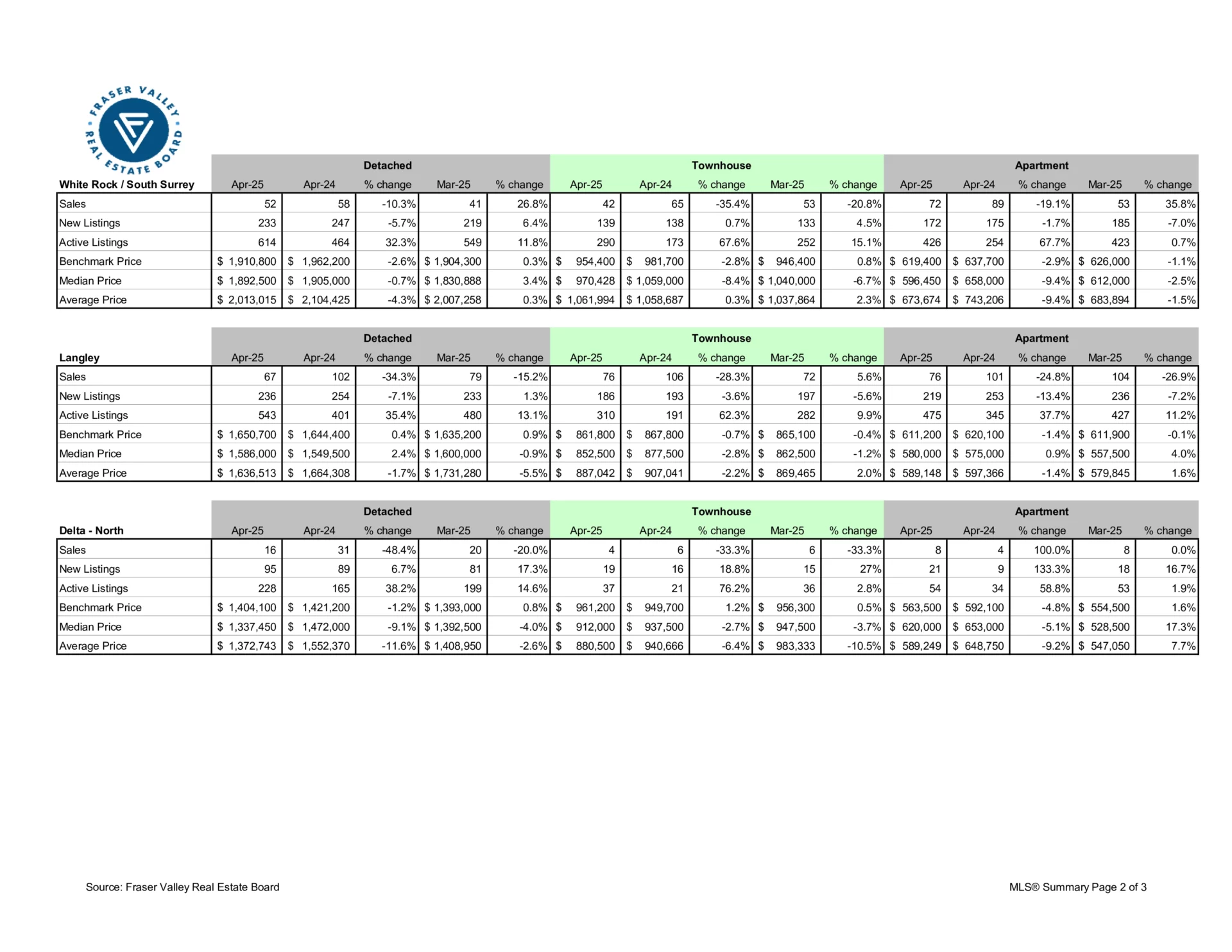 • Townhomes: At $833,100 the Benchmark price for an FVREB townhome decreased 0.1 per cent compared to March 2025 and decreased 2.4 per cent compared to April 2024.
