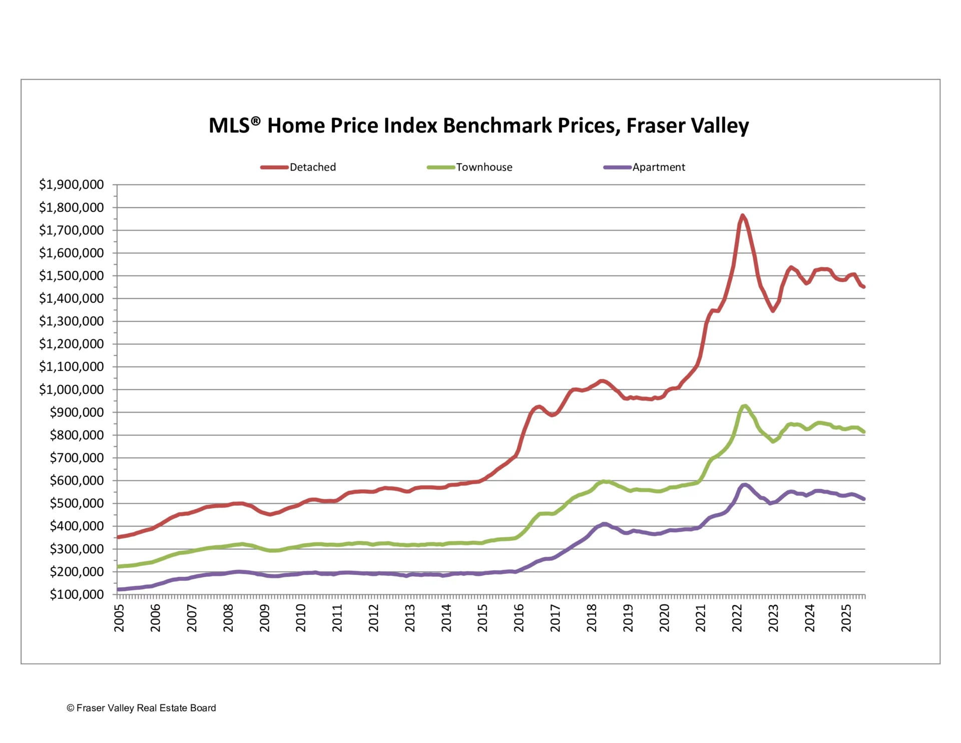 Single Family Detached: At $1,451,100, the Benchmark price for an FVREB single-family detached home decreased 0.5 per cent compared to June 2025 and decreased 5.1 per cent compared to July 2024.