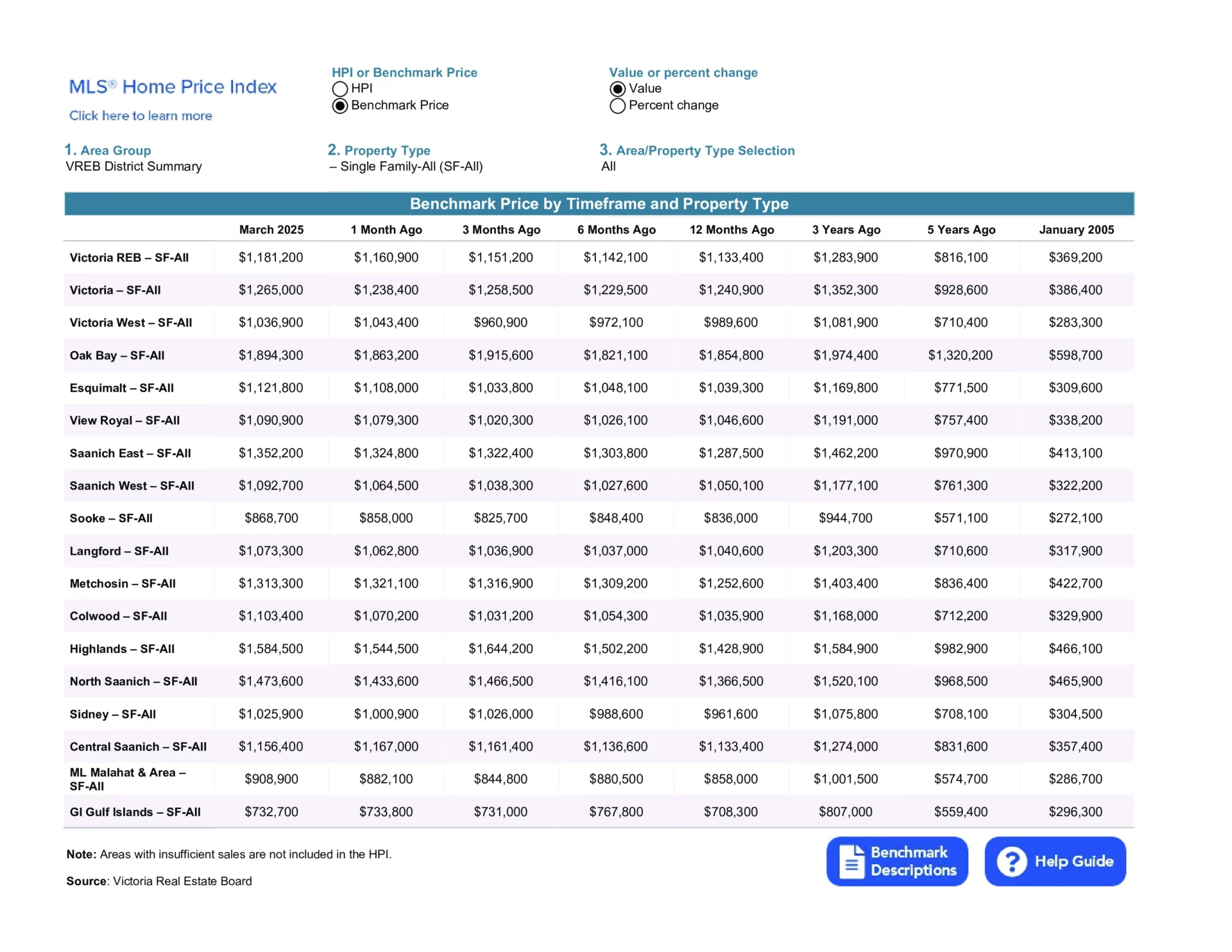 The Multiple Listing Service® Home Price Index benchmark value for a single family home in the Victoria Core in March 2024 was $1,288,400. The benchmark value for the same home in March 2025 increased by 3.6 per cent to $1,335,300, up from February’s value of $1,309,500. The MLS® HPI benchmark value for a condominium in the Victoria Core area in March 2024 was $558,200 while the benchmark value for the same condominium in March 2025 increased by 0.4 per cent to $560,400, up from the February value of $551,900.