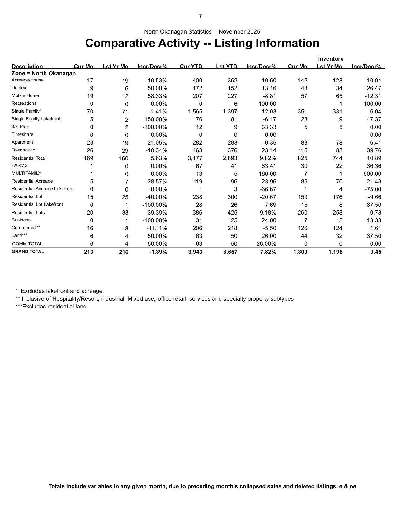 A total of 939 residential unit sales were recorded across the Association region in November, down from October’s 1,274 units, and down 5.1% compared to units sold in November last year. New residential listings saw a 6.6% decrease compared to November 2024 with 1,490 new listings recorded last month. The total number of active listings saw a 0.3% increase in inventory compared to November 2024 with 7,909 recorded across the Association region. The highest percentage increase in active listings across the Association region was recorded for a second consecutive month in the North Okanagan with a total increase of 10.9% compared to the same month last year.