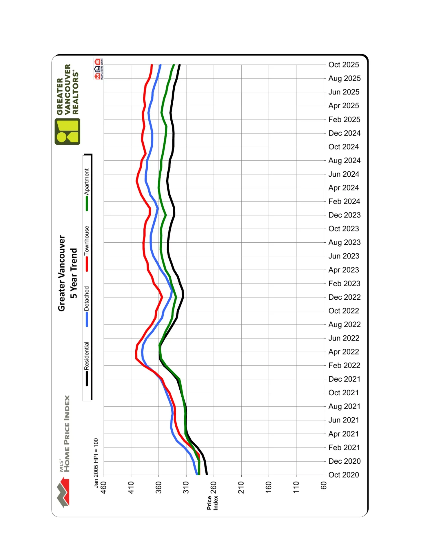 The MLS® Home Price Index composite benchmark price for all residential properties in Metro Vancouver is currently $1,132,500. This represents a 3.4 per cent decrease over October 2024 and a 0.8 per cent decrease compared to September 2025.