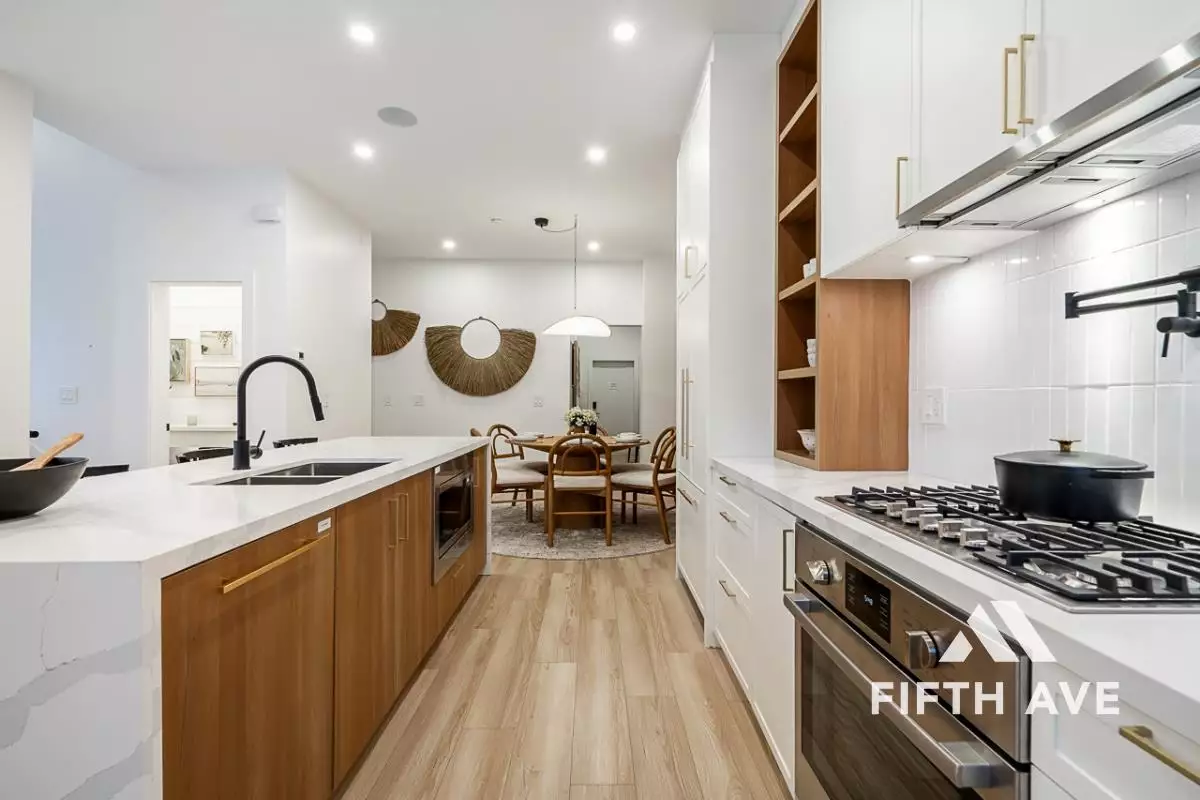 The main living areas boast 8” wide-plank laminate flooring, modern matte black door hardware, and wood panelled fireplaces, creating a warm and inviting atmosphere. The kitchens are equipped with modern slim Shaker-style cabinets, quartz countertops, high-end appliances, and spacious walk-in pantries, ensuring both functionality and style.