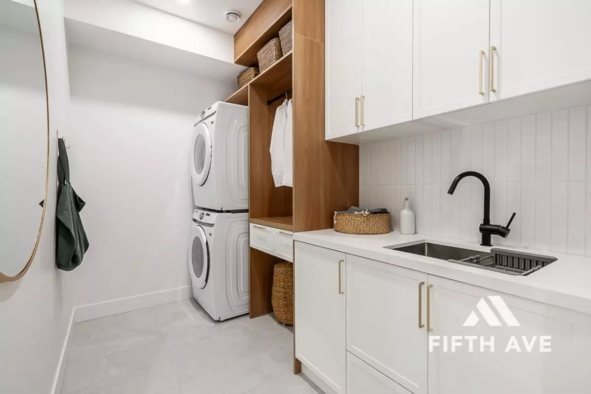 Grovemont bathrooms feature Japanese Wet Rooms, soft close cabinets, and quartz countertops, blending luxury with practicality. The laundry rooms are designed for convenience, with Energy Star appliances, ample storage, and full-height tile backsplashes.