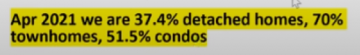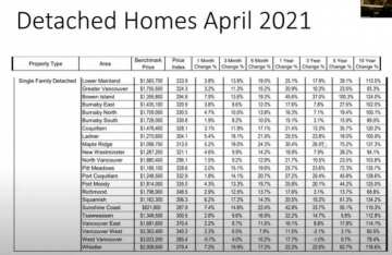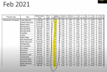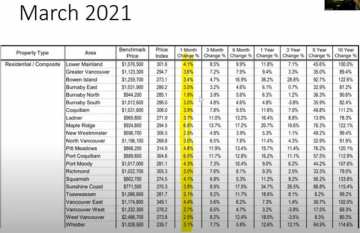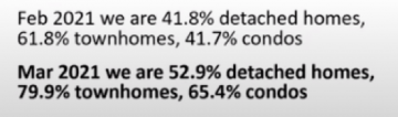 If you look at some of these numbers — a 3.1% change in overall composite price for the Lower Mainland per month. If you annualize that, it’s a 36% increase in value for the whole year. We’re looking at some pretty steep price rises. These prices will rise because of sales ratios – anytime they’re above 12%, prices will rise. For single-family houses, they’re around 37.4%, condos are about 51.5%, and townhomes are about 70%. But, within the market you’ll have different ratios — for example, downtown Vancouver has a very low sales ratio for condos so that could be a place to get some real value. A lot of people are still concerned about COVID, but once people are vaccinated and we have herd immunity, I think they’ll realize what a great place downtown Vancouver is to live. People will want the busy shopping, restaurants and patios again.