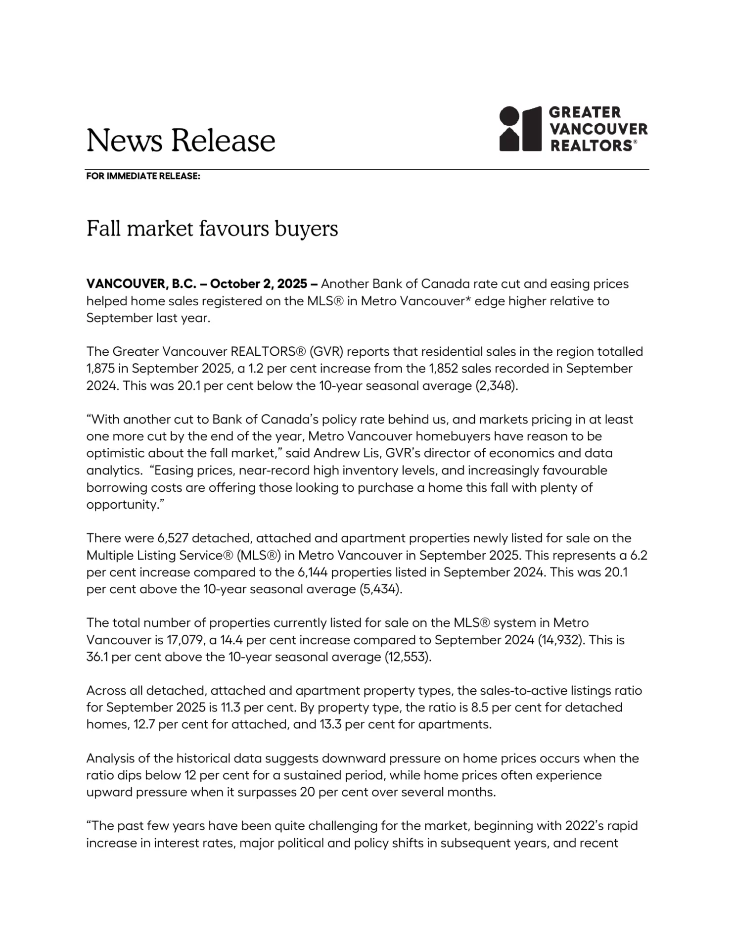 VANCOUVER, B.C. – October 2, 2025 – Another Bank of Canada rate cut and easing prices helped home sales registered on the MLS® in Metro Vancouver edge higher relative to September last year.