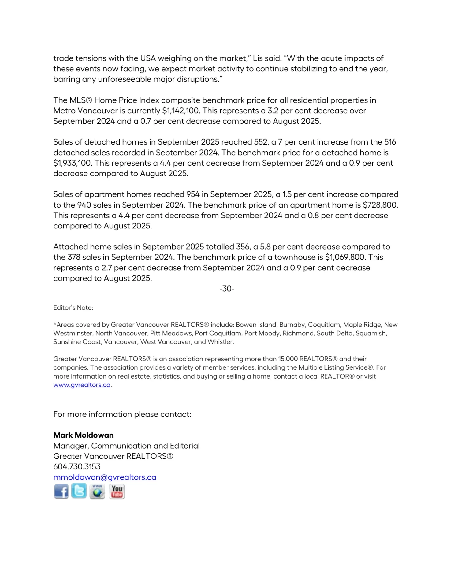 “With another cut to Bank of Canada’s policy rate behind us, and markets pricing in at least one more cut by the end of the year, Metro Vancouver homebuyers have reason to be optimistic about the fall market,” said Andrew Lis, GVR’s director of economics and data analytics. “Easing prices, near-record high inventory levels, and increasingly favourable borrowing costs are offering those looking to purchase a home this fall with plenty of opportunity.”
