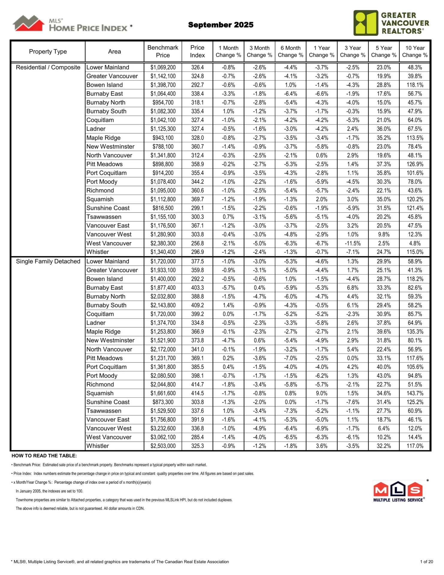 The MLS® Home Price Index composite benchmark price for all residential properties in Metro Vancouver is currently $1,142,100. This represents a 3.2 per cent decrease over September 2024 and a 0.7 per cent decrease compared to August 2025.