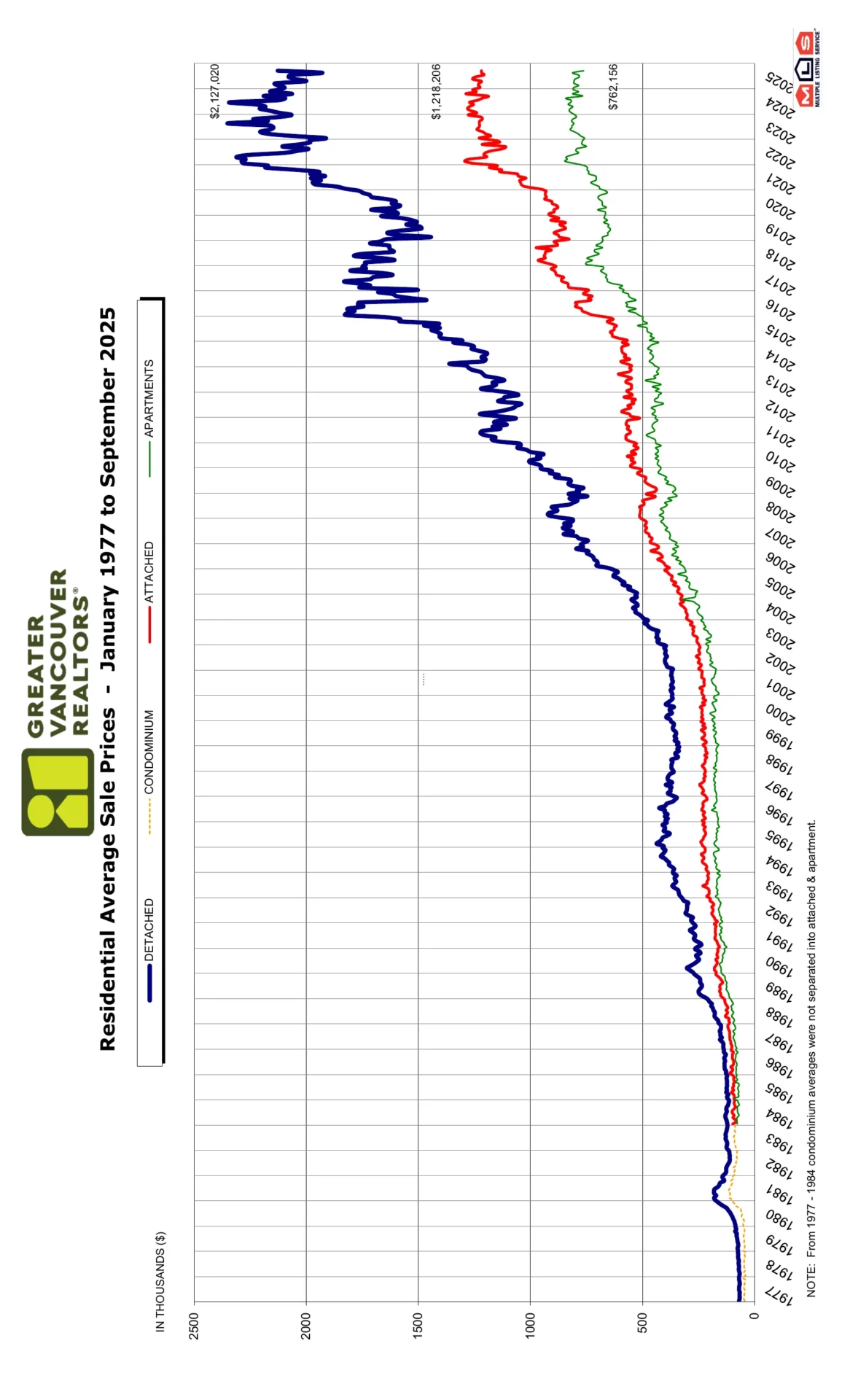 Attached home sales in September 2025 totalled 356, a 5.8 per cent decrease compared to the 378 sales in September 2024. The benchmark price of a townhouse is $1,069,800. This represents a 2.7 per cent decrease from September 2024 and a 0.9 per cent decrease compared to August 2025.